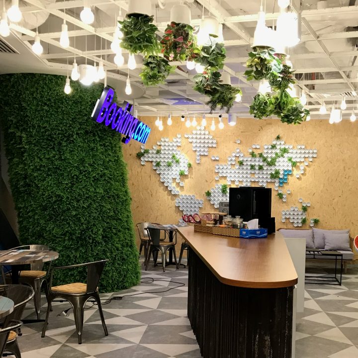 Tại Booking.com TP.HCM, không gian làm việc được thiết kế để khuyến khích kết nối với thiên nhiên, tạo ra một môi trường làm việc thư giãn và sáng tạo. Bằng cách sử dụng các yếu tố tự nhiên như cây xanh, ánh sáng tự nhiên và vật liệu tự nhiên như gỗ và đá, không gian công ty mang lại một cảm giác dễ chịu và thúc đẩy sức khỏe tổng thể của nhân viên.