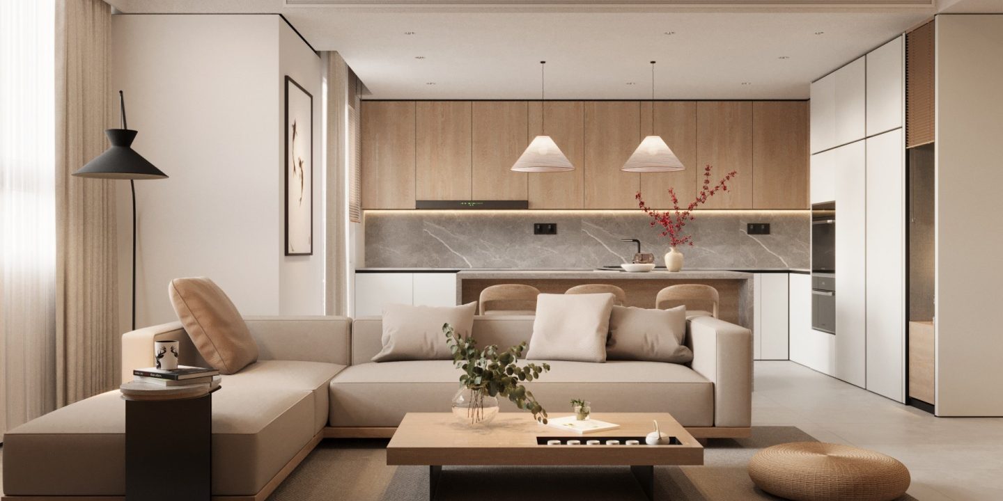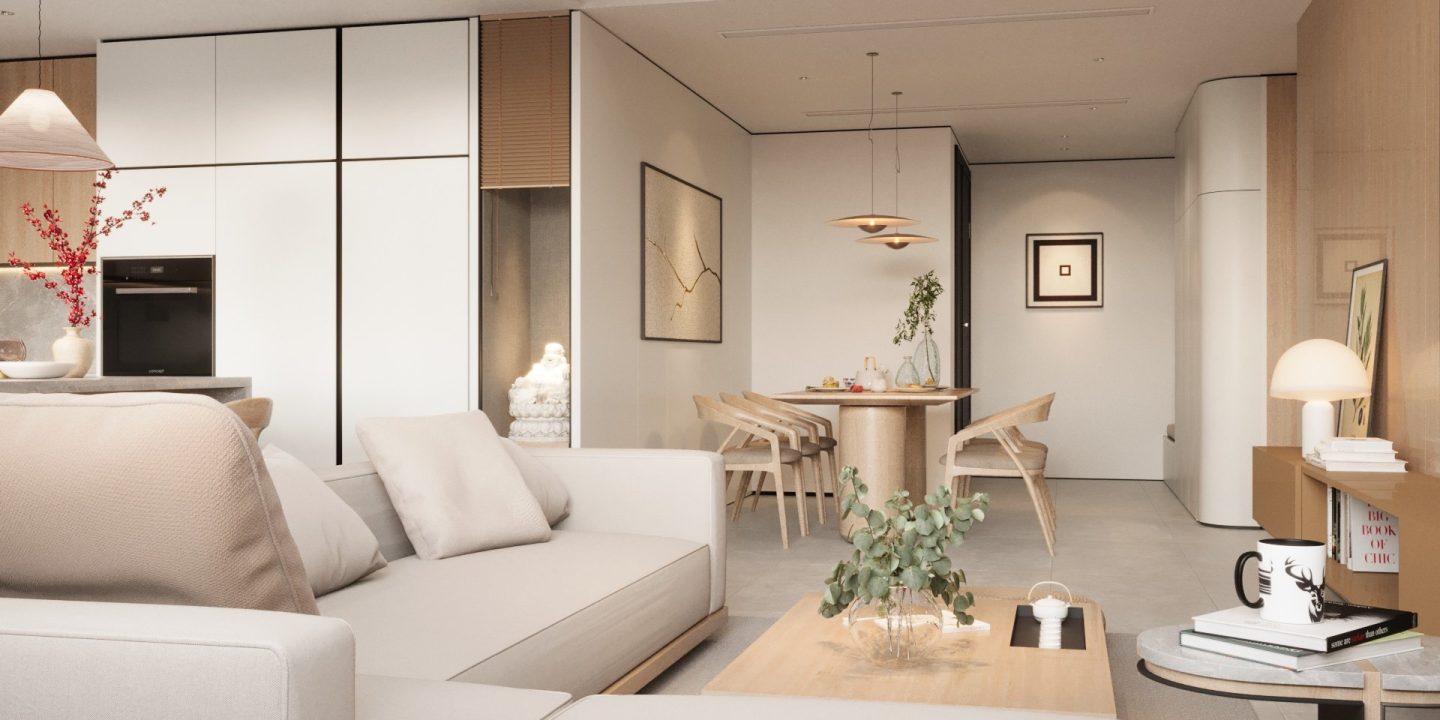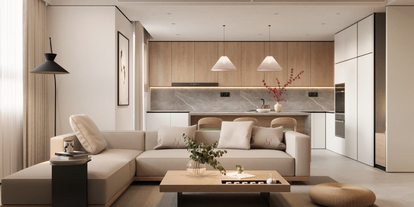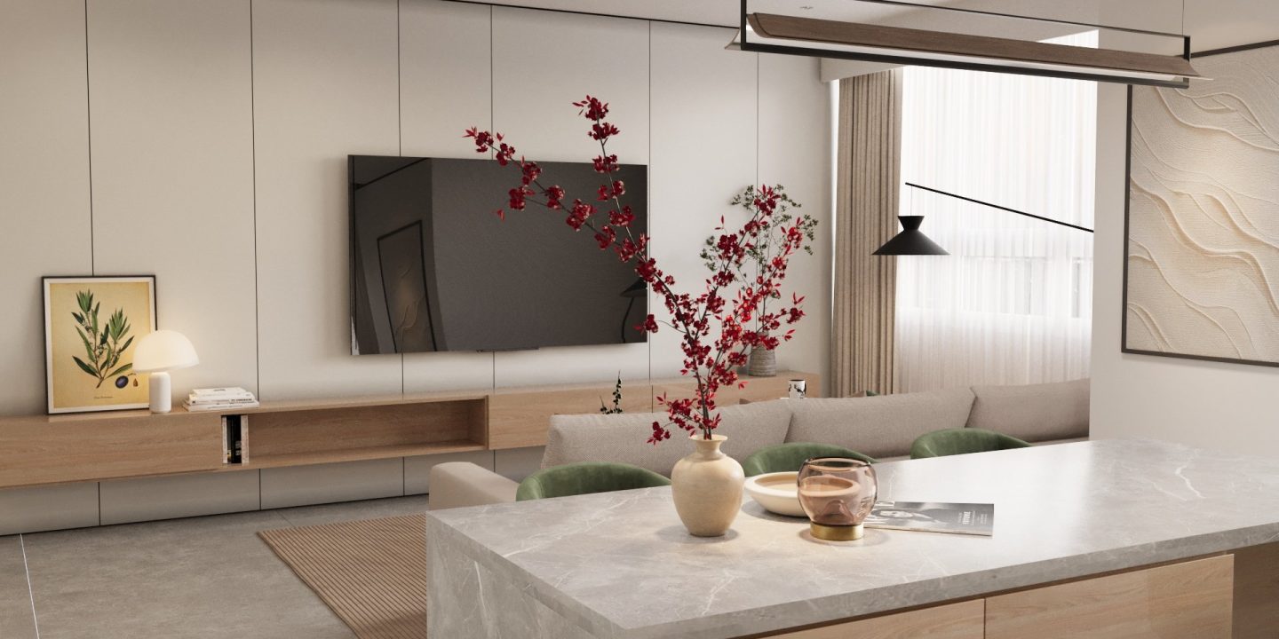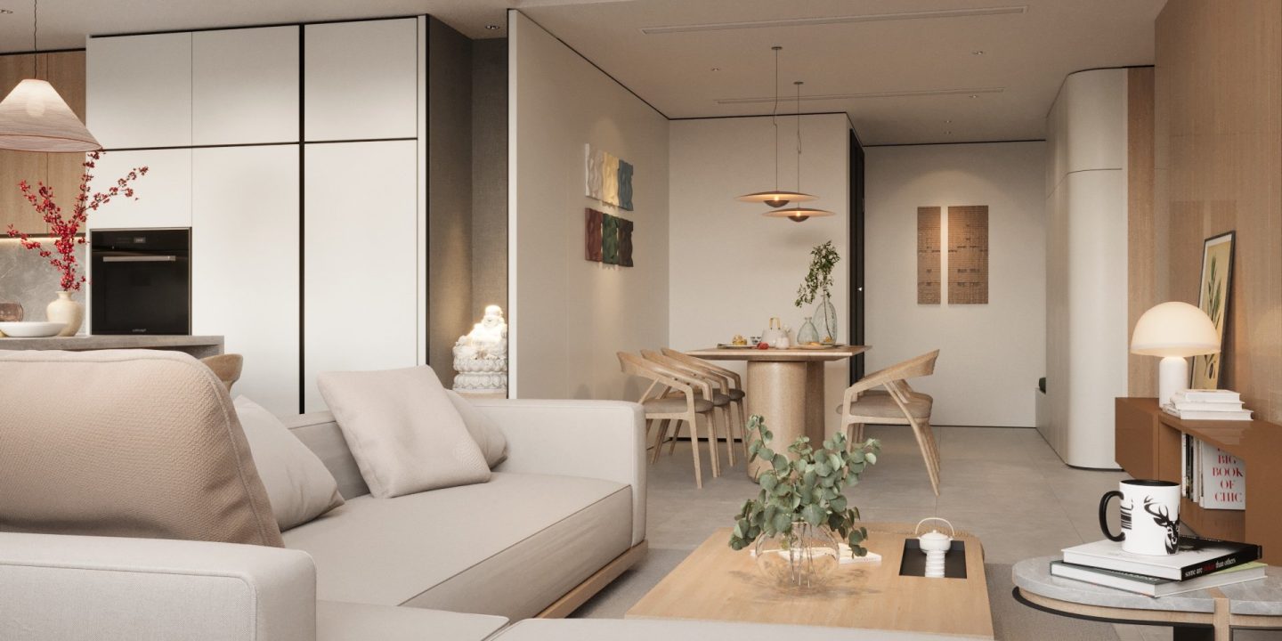 Căn hộ mang hơi thở Japandi hiện đại, là sự giao thoa tinh tế giữa phong cách Nhật Bản và Bắc Âu – nơi tôn vinh những giá trị cốt lõi: tĩnh tại, giản đơn và gần gũi với thiên nhiên. Không gian được định hình bởi bảng màu trung tính thanh thoát – từ trắng, kem, be đến xám vân đá – tạo cảm giác nhẹ nhàng, thư giãn ngay từ ánh nhìn đầu tiên.