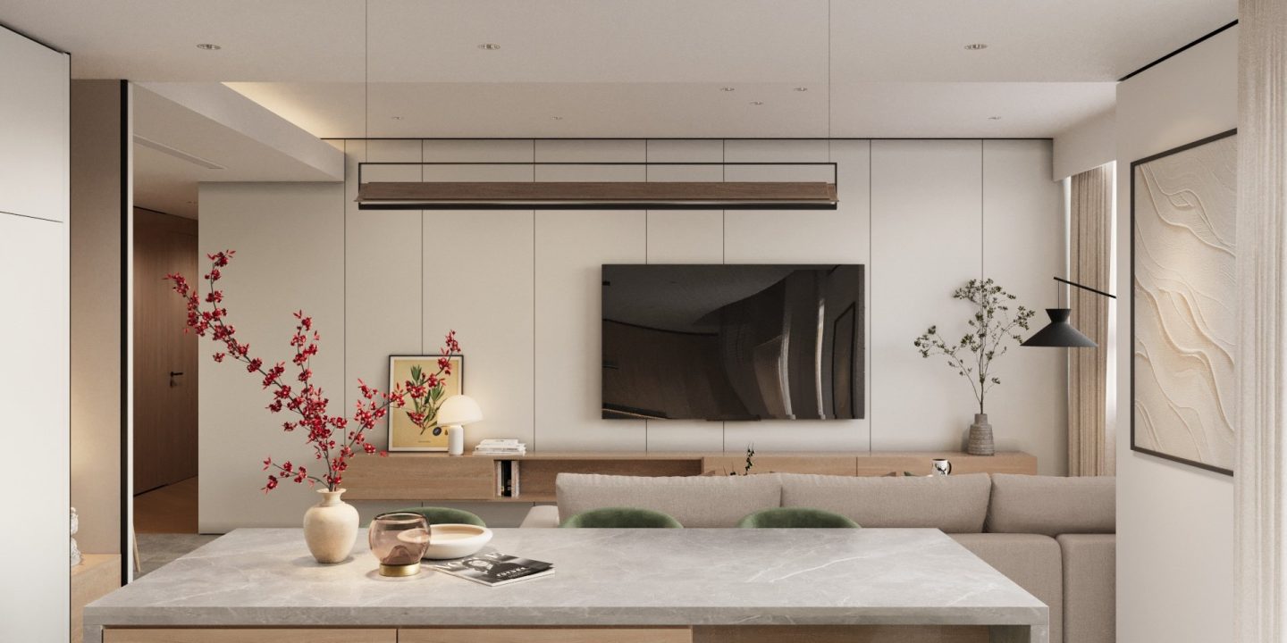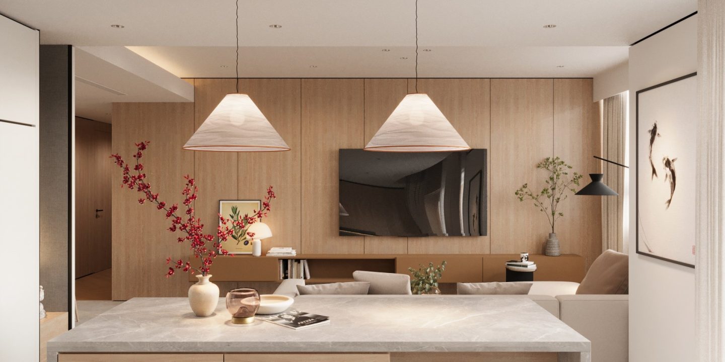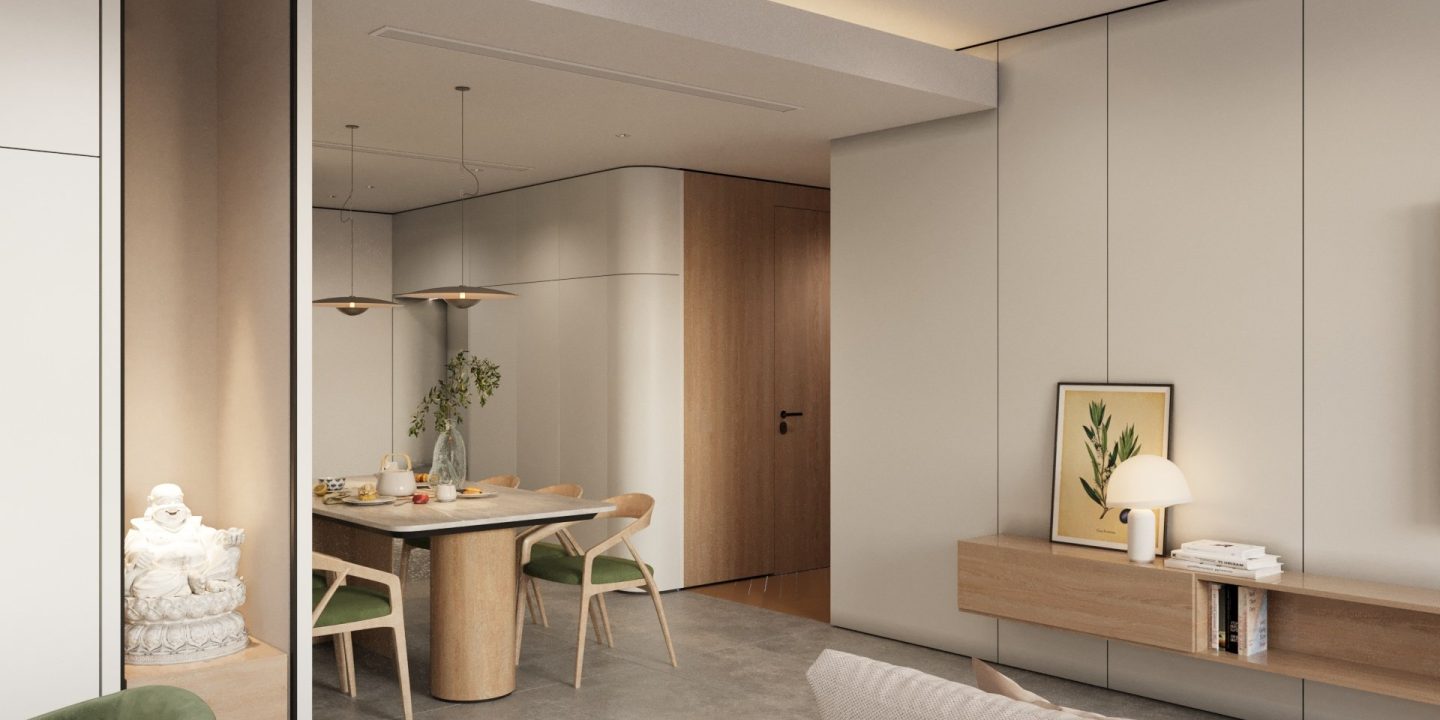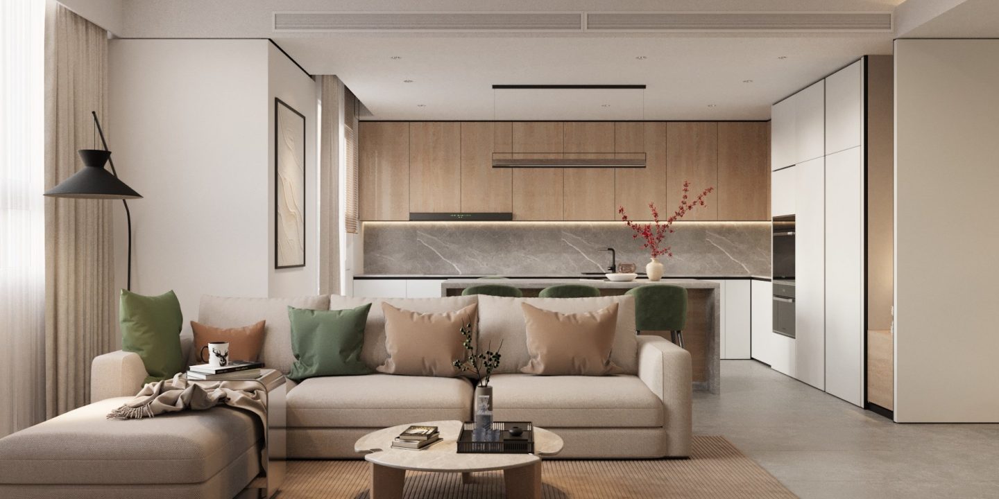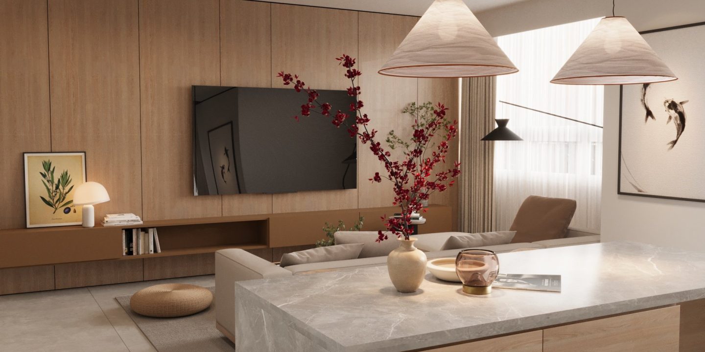 Căn hộ mang hơi thở Japandi hiện đại, là sự giao thoa tinh tế giữa phong cách Nhật Bản và Bắc Âu – nơi tôn vinh những giá trị cốt lõi: tĩnh tại, giản đơn và gần gũi với thiên nhiên. Không gian được định hình bởi bảng màu trung tính thanh thoát – từ trắng, kem, be đến xám vân đá – tạo cảm giác nhẹ nhàng, thư giãn ngay từ ánh nhìn đầu tiên.