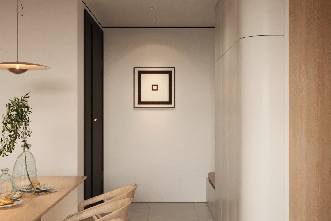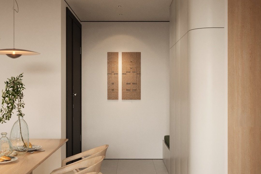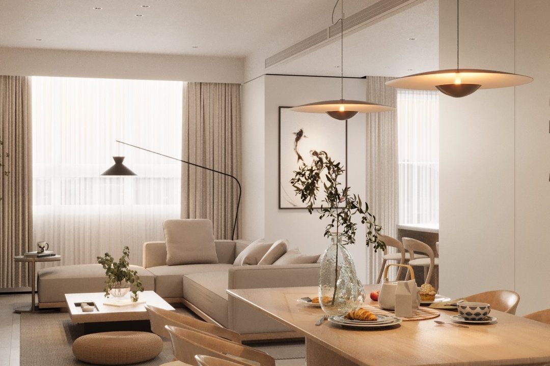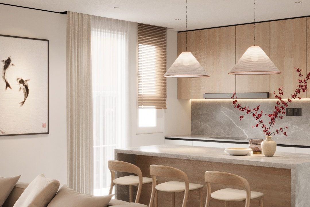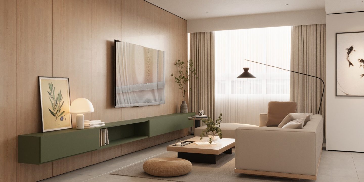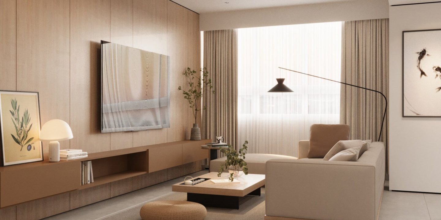 Căn hộ mang hơi thở Japandi hiện đại, là sự giao thoa tinh tế giữa phong cách Nhật Bản và Bắc Âu – nơi tôn vinh những giá trị cốt lõi: tĩnh tại, giản đơn và gần gũi với thiên nhiên. Không gian được định hình bởi bảng màu trung tính thanh thoát – từ trắng, kem, be đến xám vân đá – tạo cảm giác nhẹ nhàng, thư giãn ngay từ ánh nhìn đầu tiên.